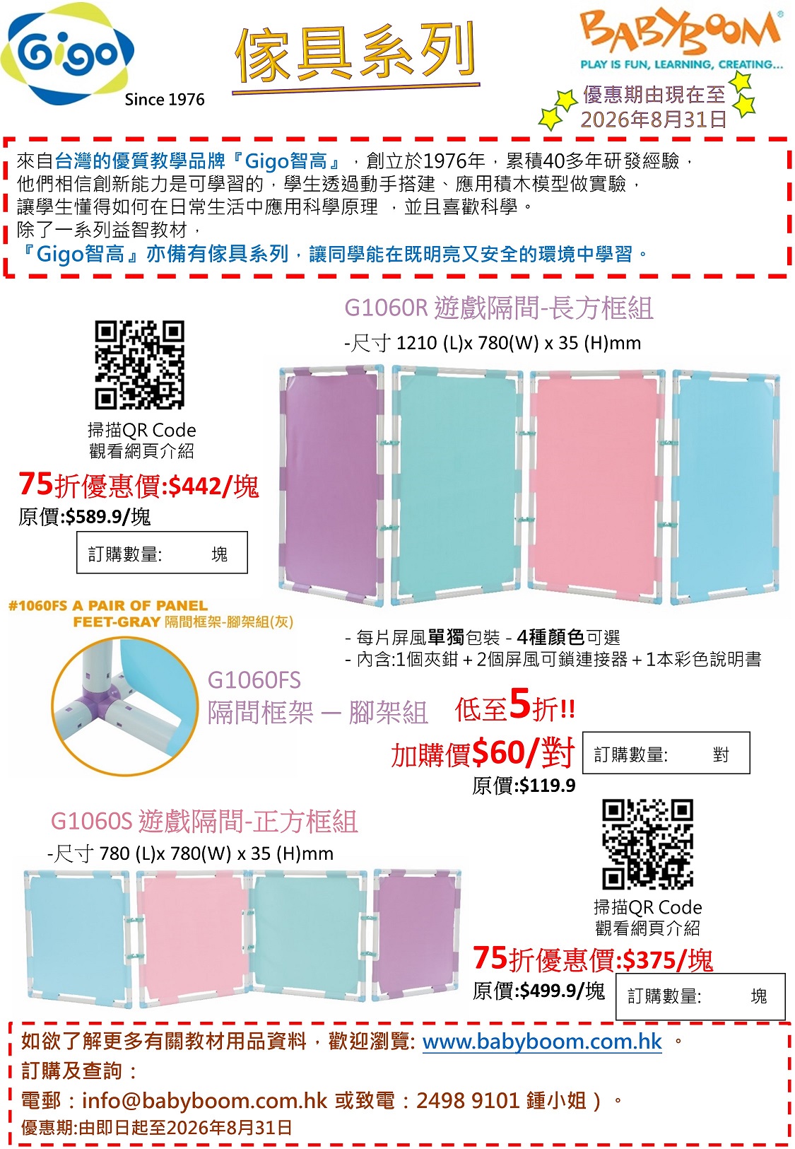 幼稚園/ 中心 教材優惠 (Gigo - 傢具系列) 優惠期至2026年8月31日