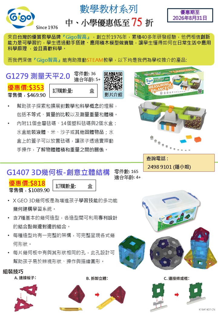 小學 教材優惠 (Gigo -Learning Lab 創意積木) 優惠期至2026年8月31日